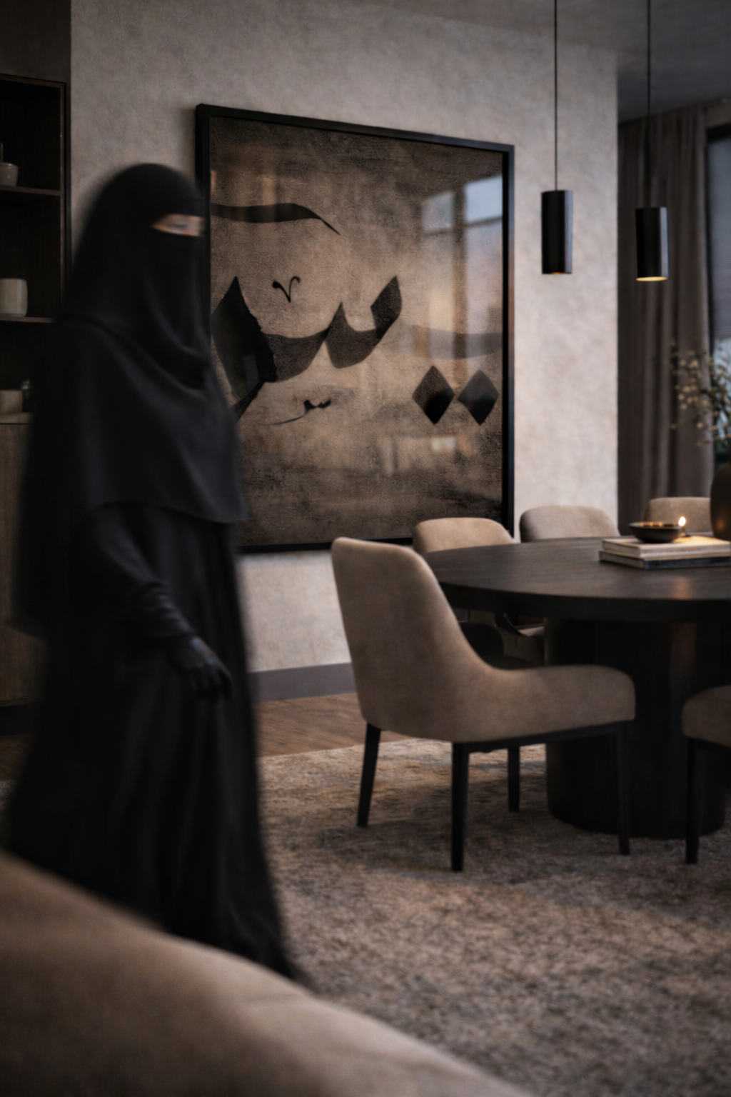 A bold, large Arabic calligraphy flows off the page, creating a strong, modern statement. The ink-style strokes give it an authentic, hand-painted feel. Set against an earthy sandy brown background.