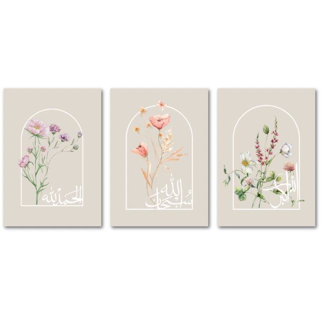 Beautify your wall with this set of 3 exquisite pieces: 'Subhanallah', 'Allahu-Akbar', and 'Alhamdulillah'. Each one is adorned with delicate water-coloured wild flowers, elegantly overlapping within arch-shaped frames.