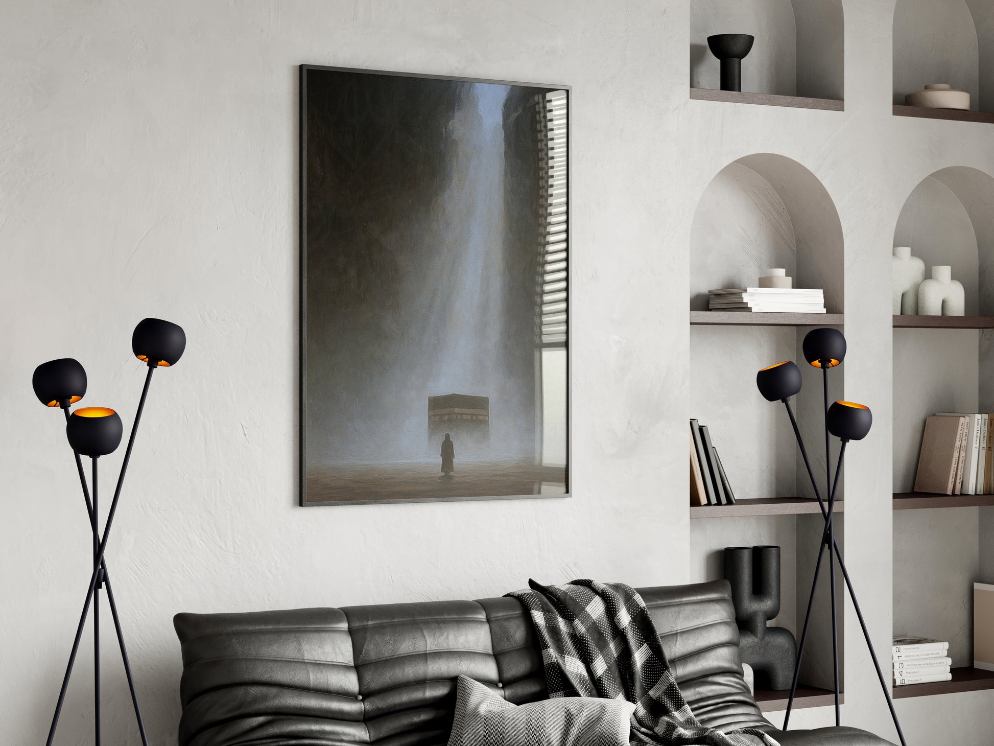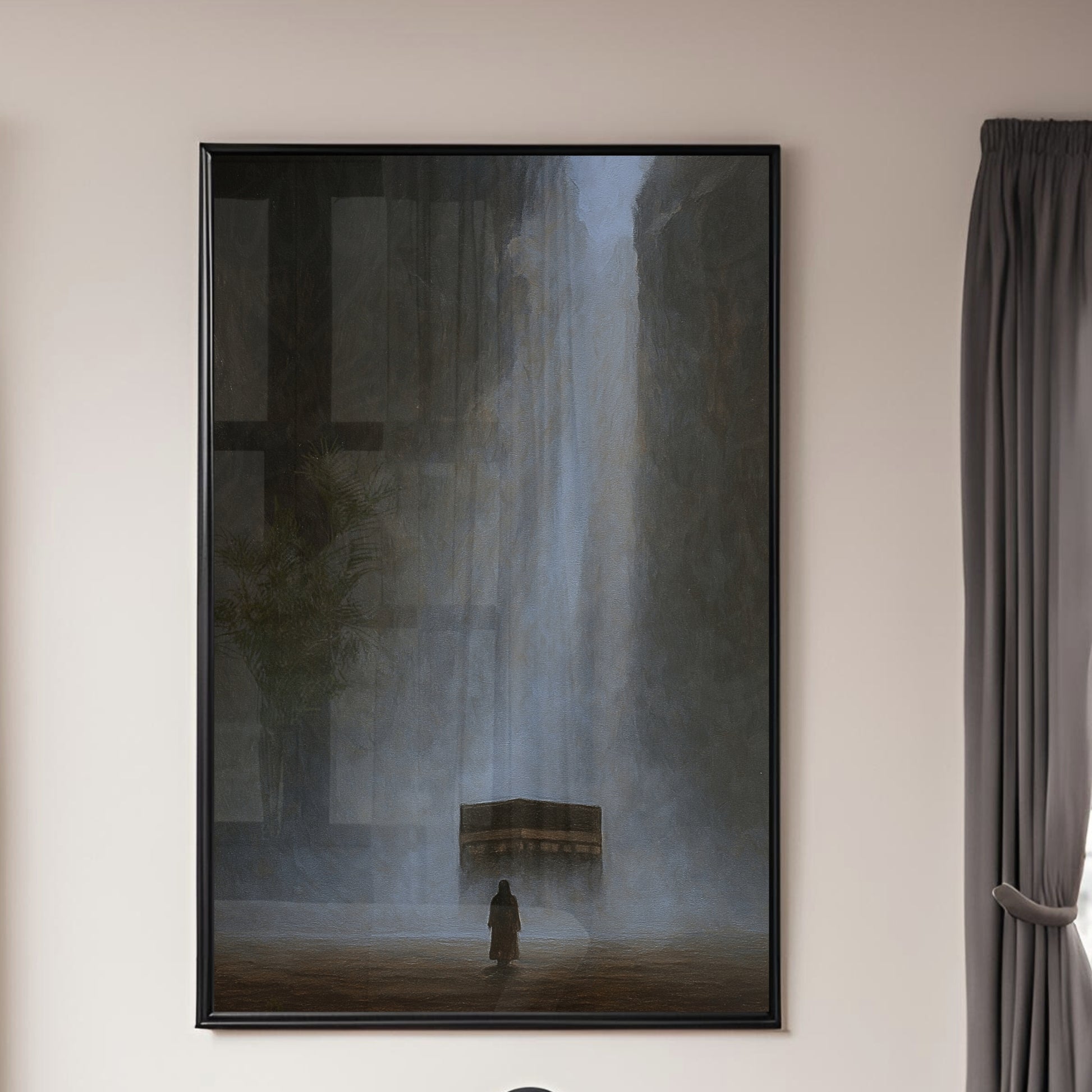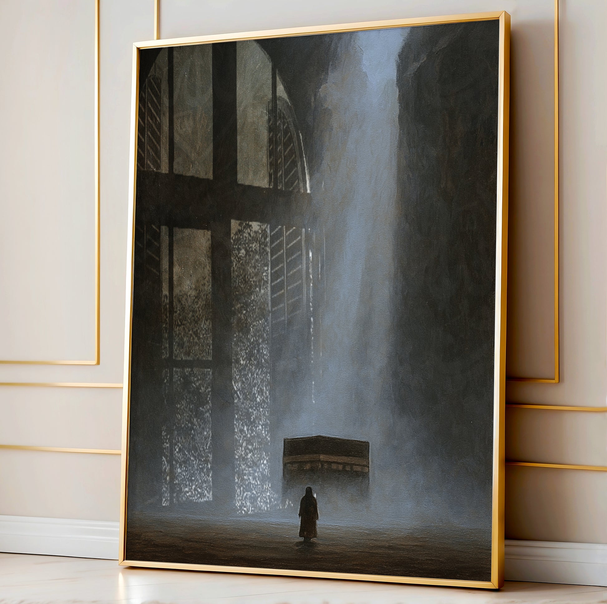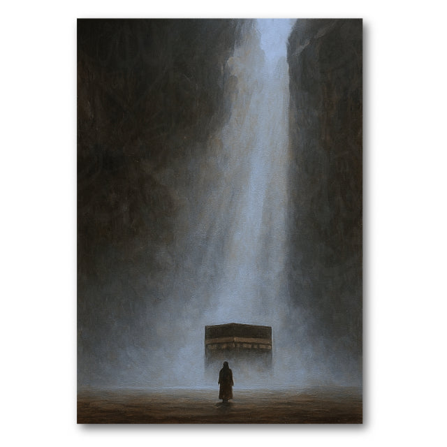 A digitally created artwork of the Kaaba, designed with a soft painting effect with subtle echoes of Tawheed flowing through the piece.