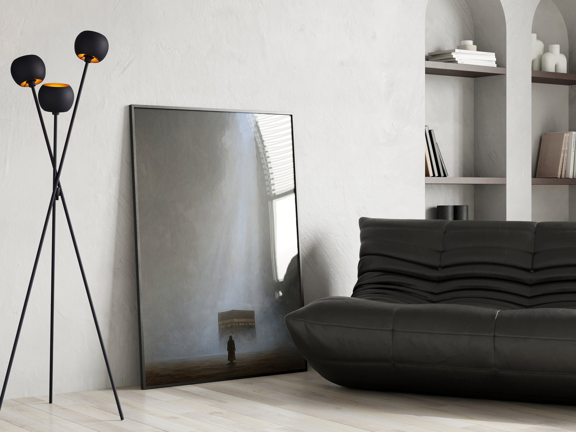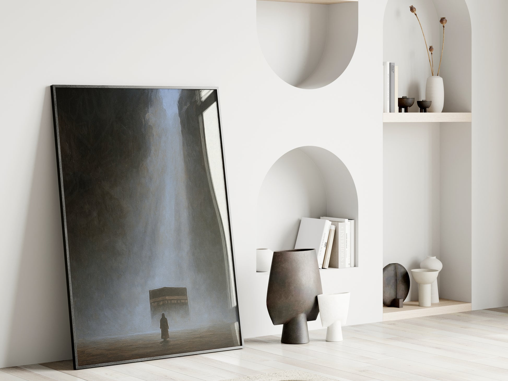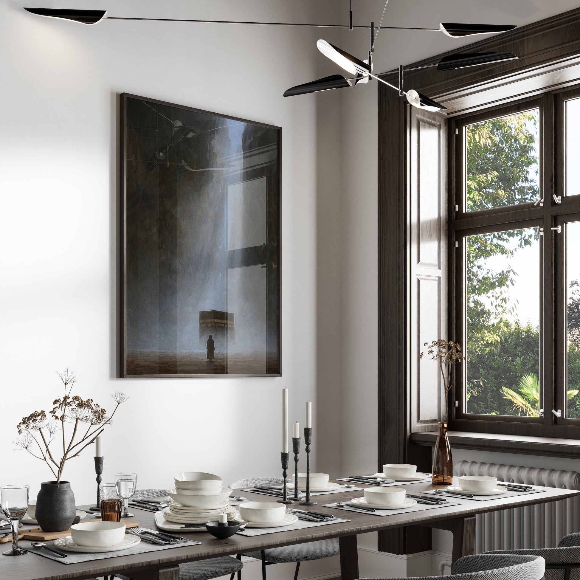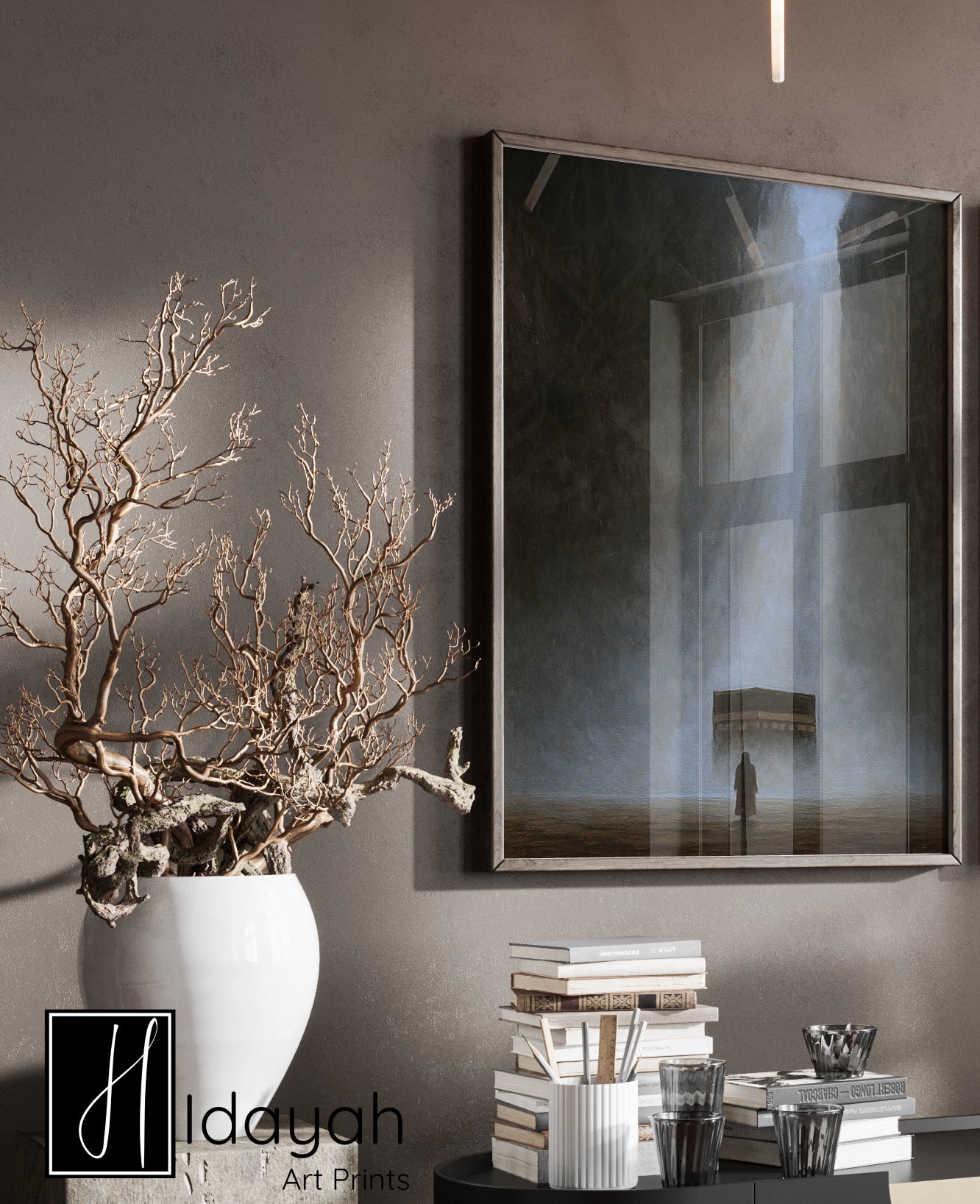 A digitally created artwork of the Kaaba, designed with a soft painting effect with subtle echoes of Tawheed flowing through the piece.