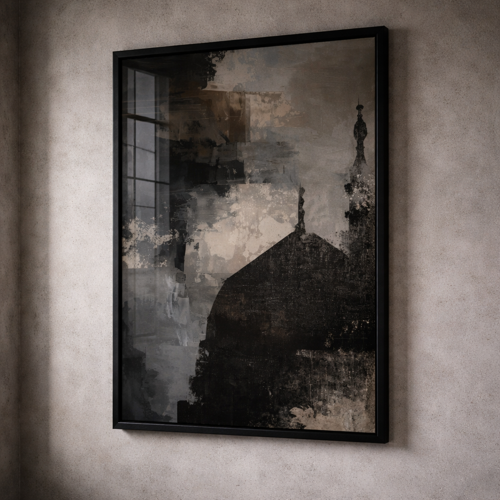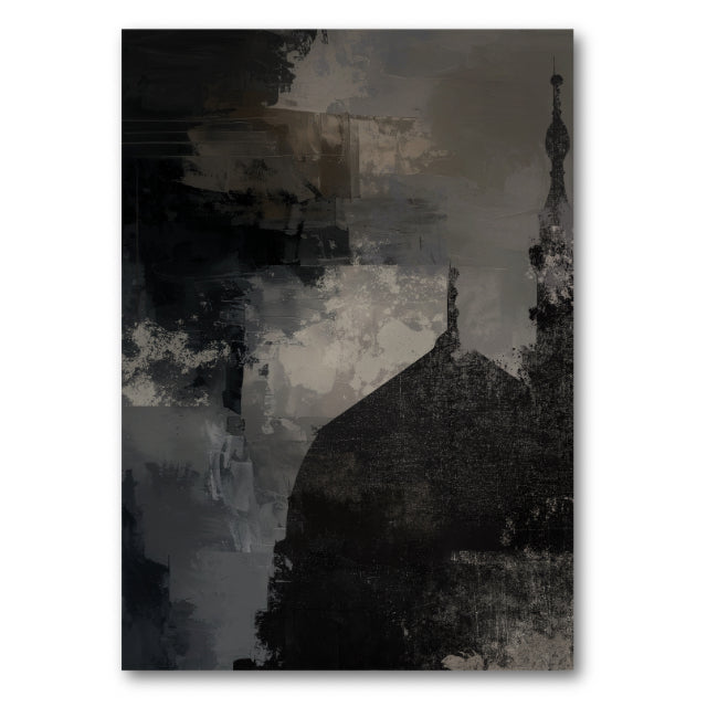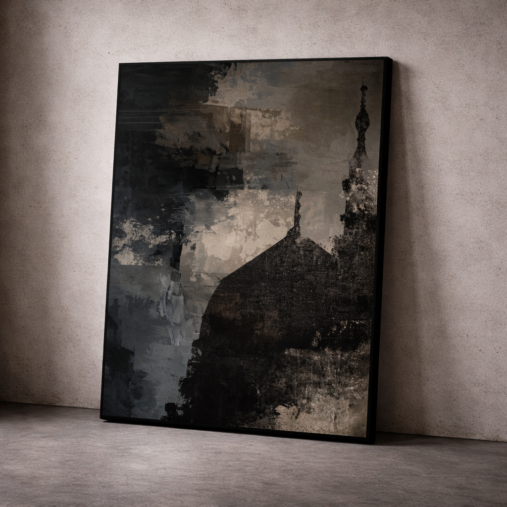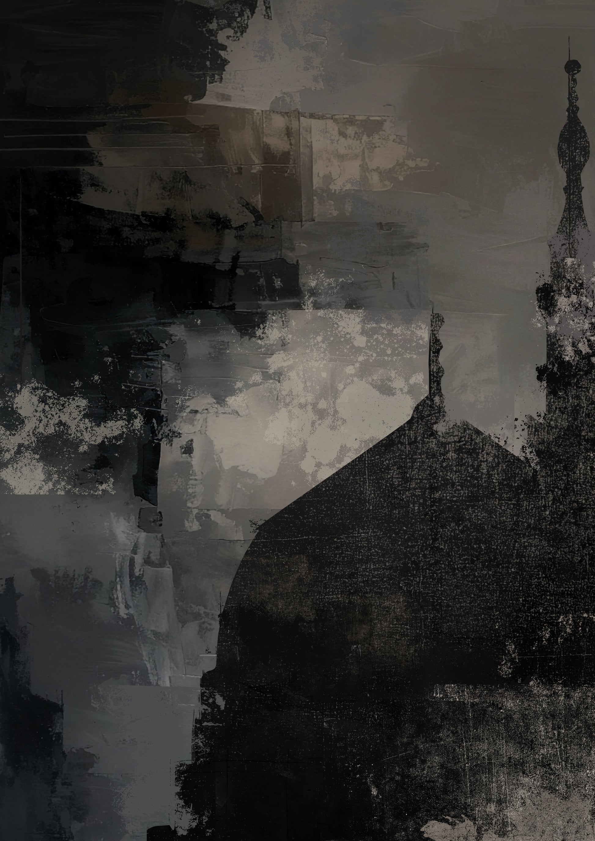 Abstract style of Masjid An-Nabawi, on a dark and dramatic acrylic painted effect background in midnight stormy shades (black, grey/beige and dark blue).