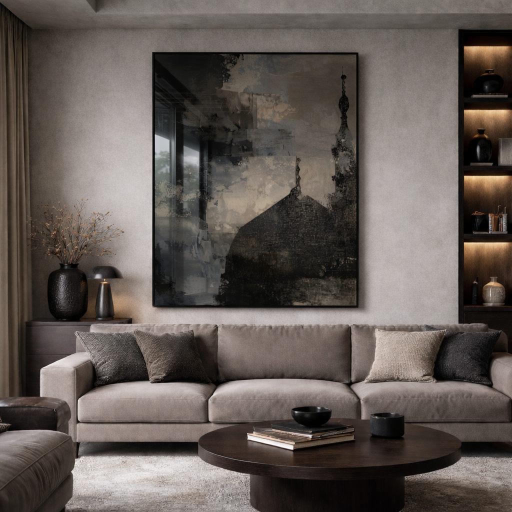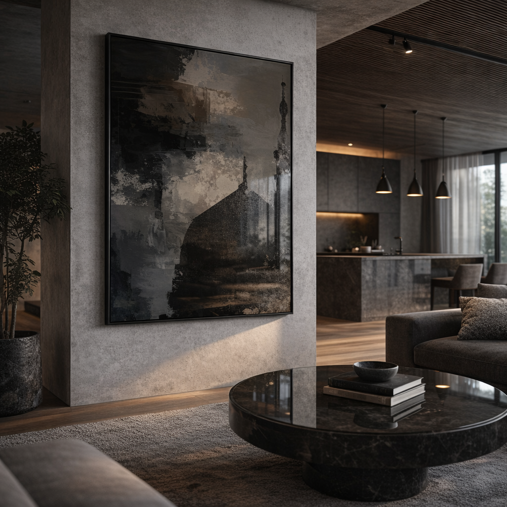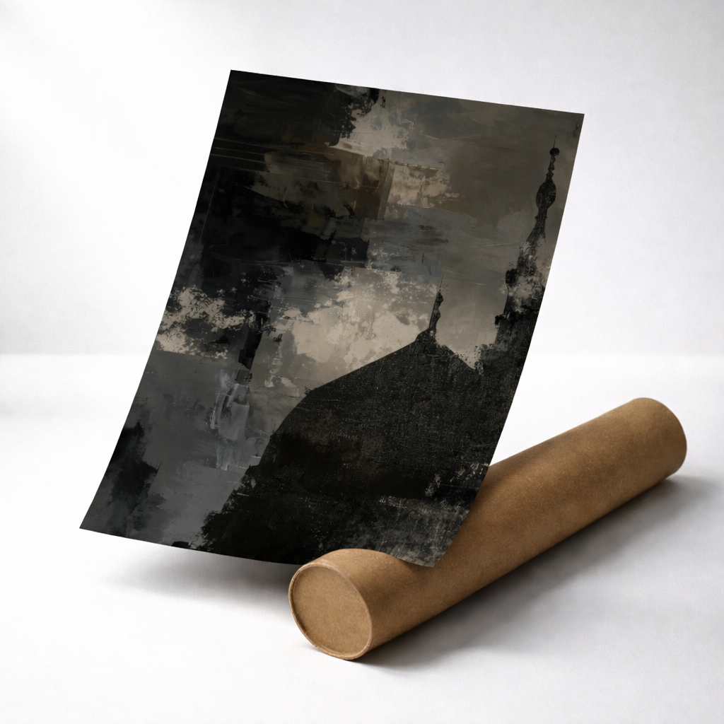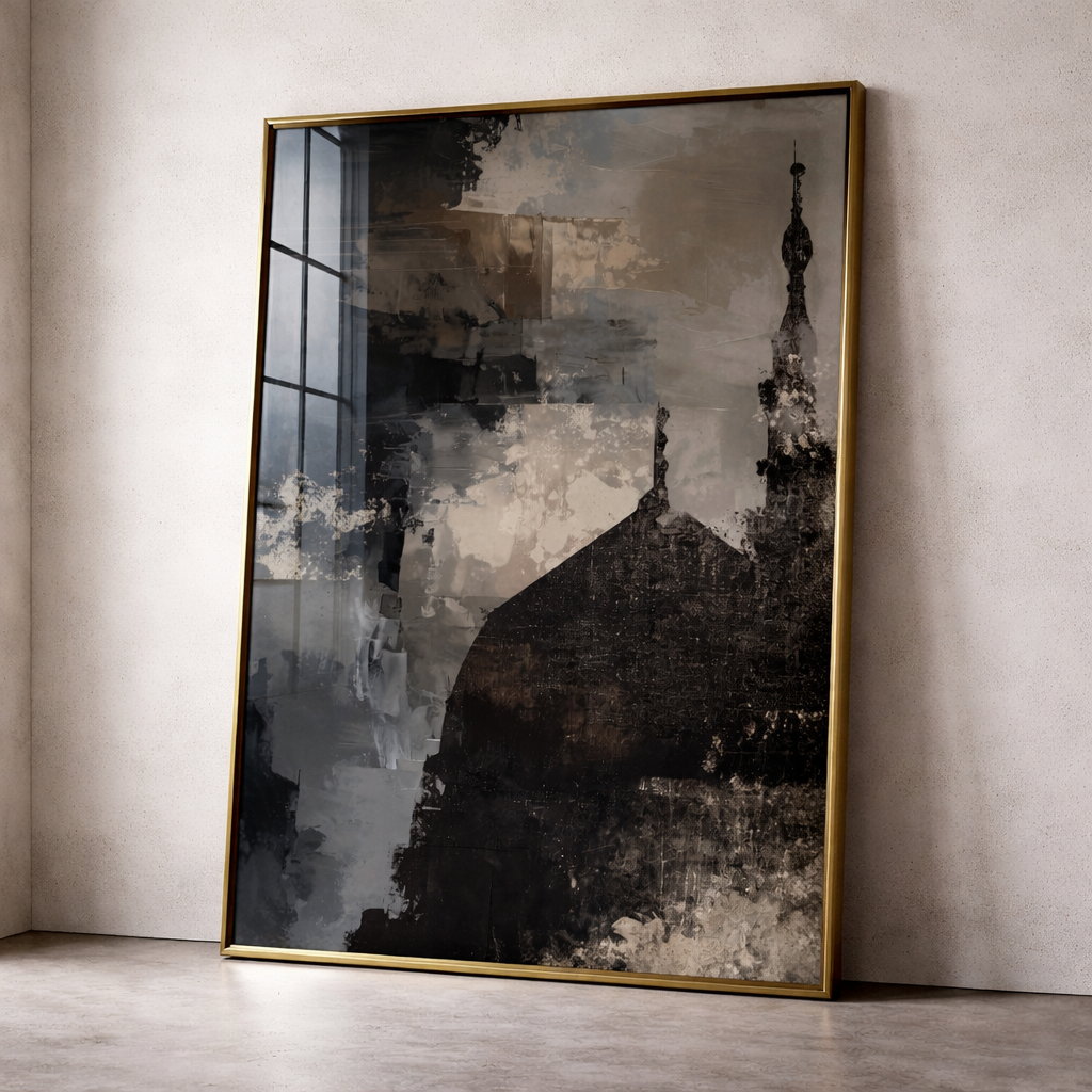 Abstract style of Masjid An-Nabawi, on a dark and dramatic acrylic painted effect background in midnight stormy shades (black, grey/beige and dark blue).
