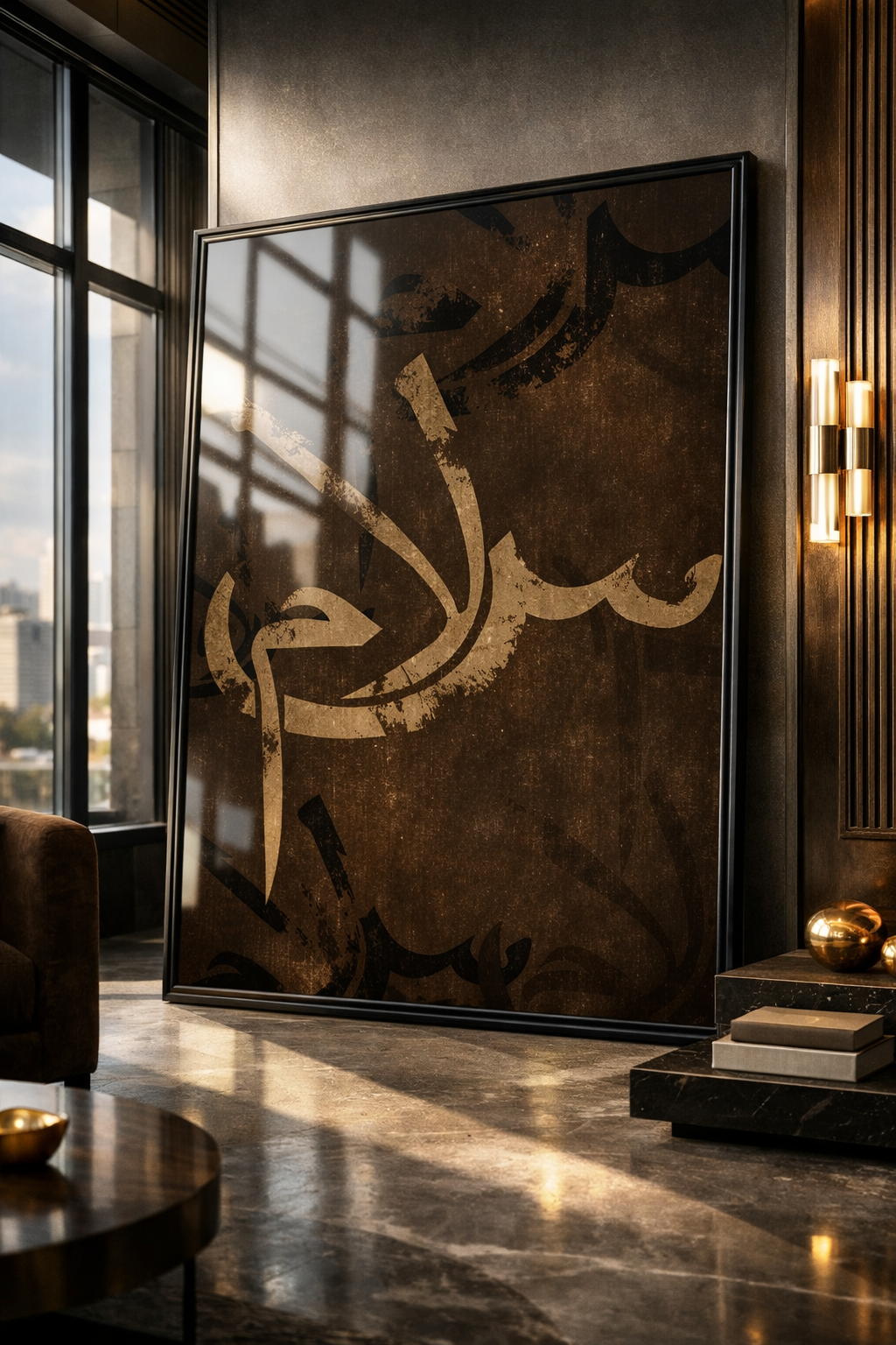 Salām Arabic calligraphy design with a dark coffee shades, antique parchment finish.