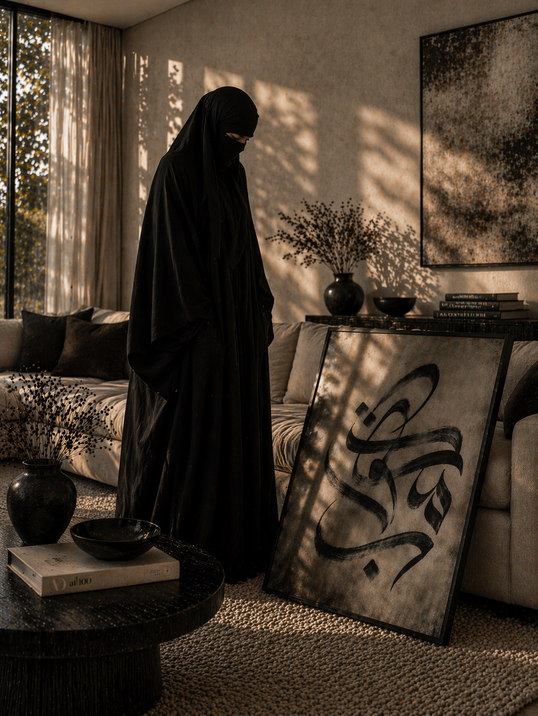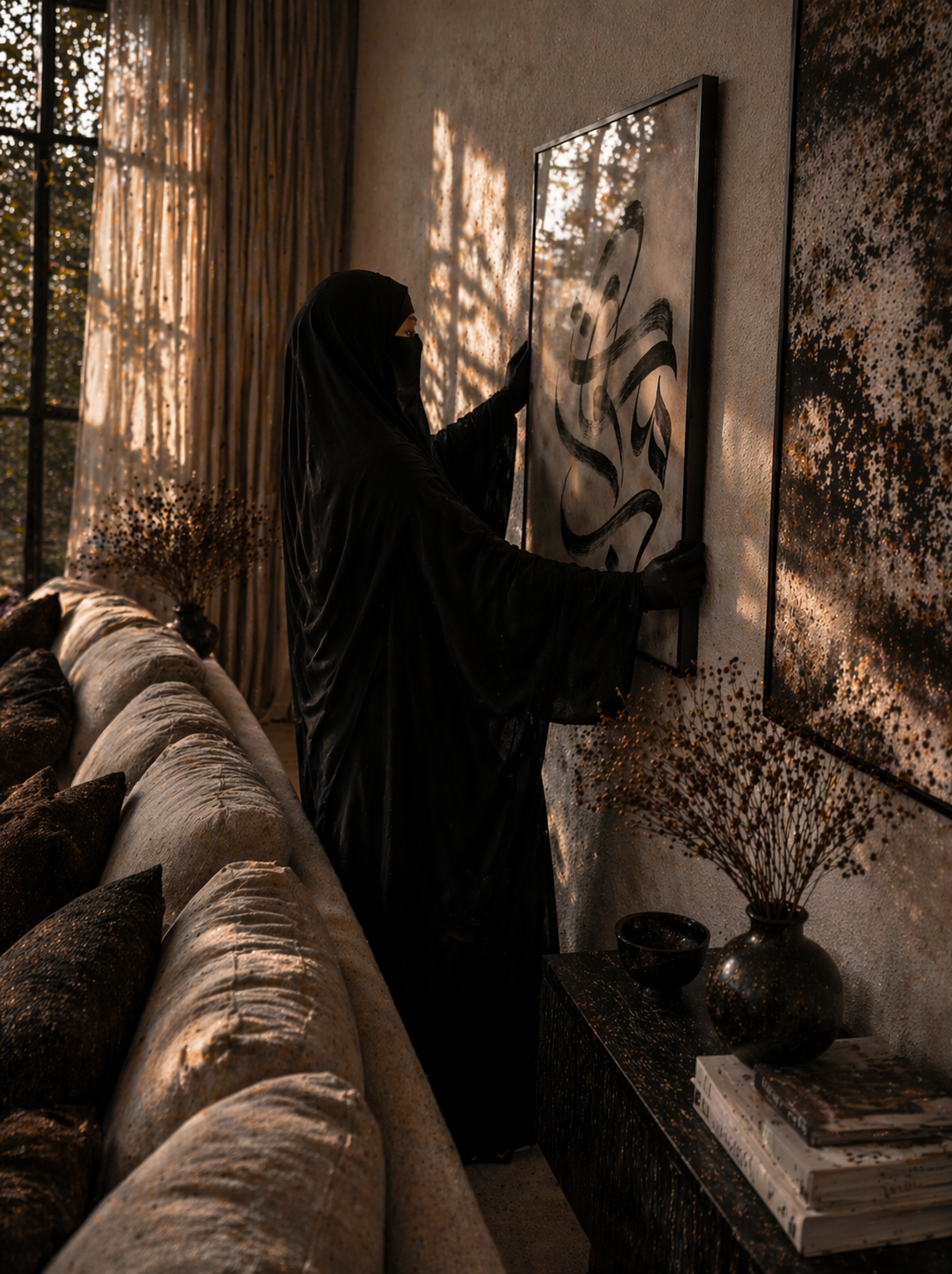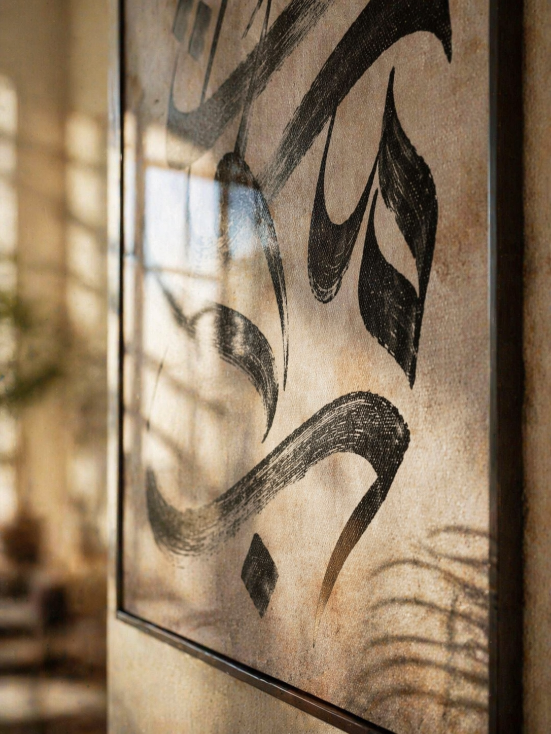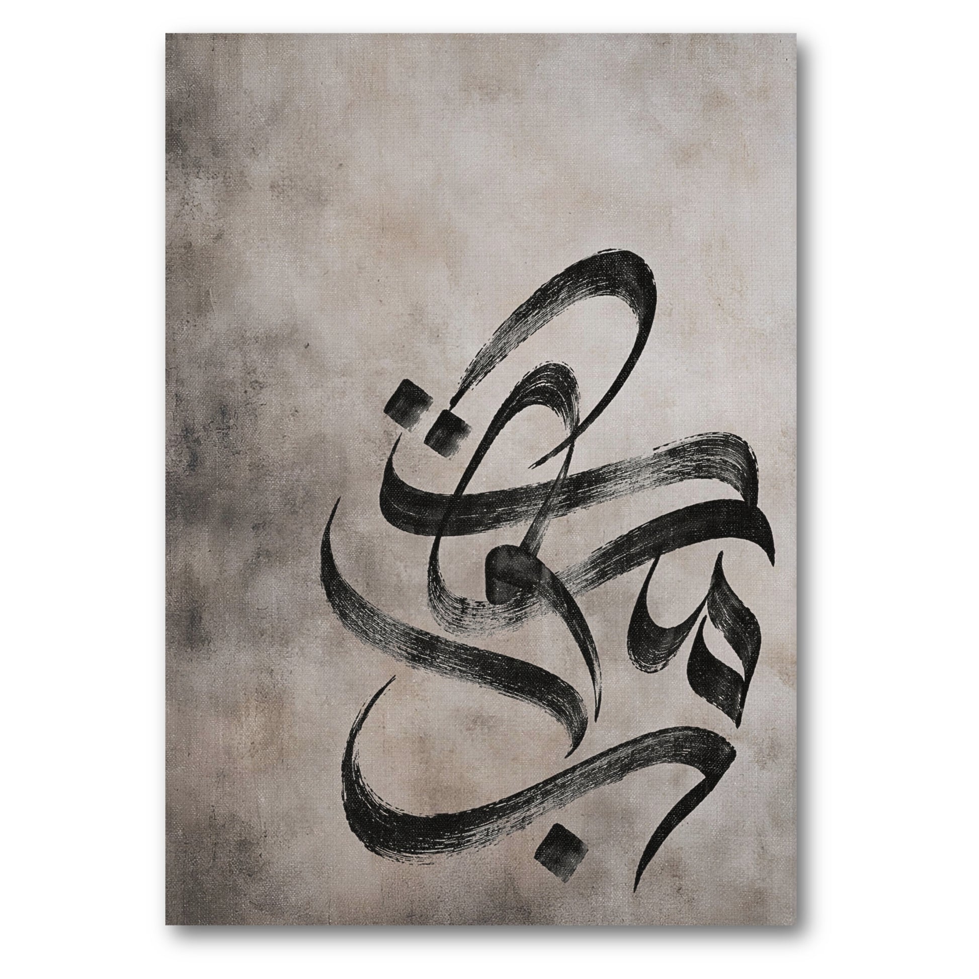 Abstract representation of wabi-sabi features the Arabic term Maktūb, which translates to "it is written." The composition showcases large calligraphy in an abstract form, complemented by a faded brushed ink effect that creates the illusion of ink-absorbed paper. This piece includes a textured canvas overlay that enhances its authenticity.
